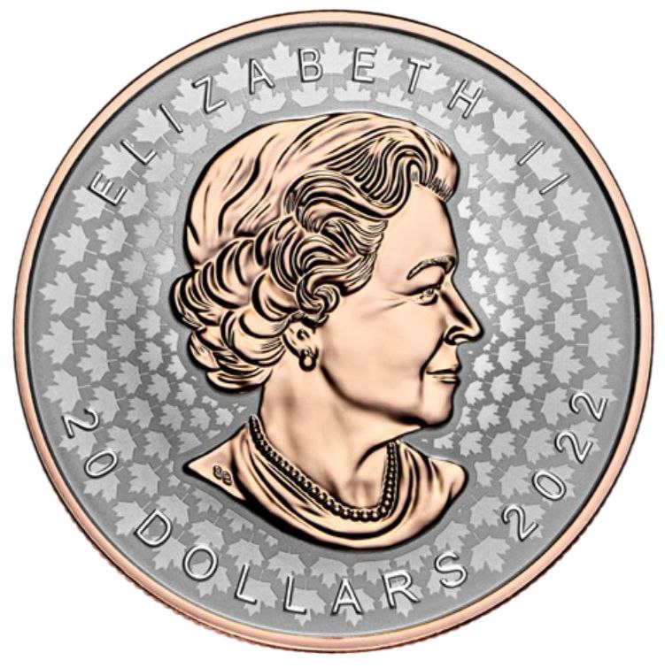 Аверс монеты украшает портрет Её Величества Королевы Елизаветы II, выполненный художницей Сюзанной Блант. Изображение монархини покрыто розовым золотом, придающим тёплое сияние и контраст зеркальному фону. По окружности расположены надписи «ELIZABETH II», «20 DOLLARS» и «2022». Фон украшен мелким узором из кленовых листьев — фирменной чертой серии, подчёркивающей внимание к деталям.