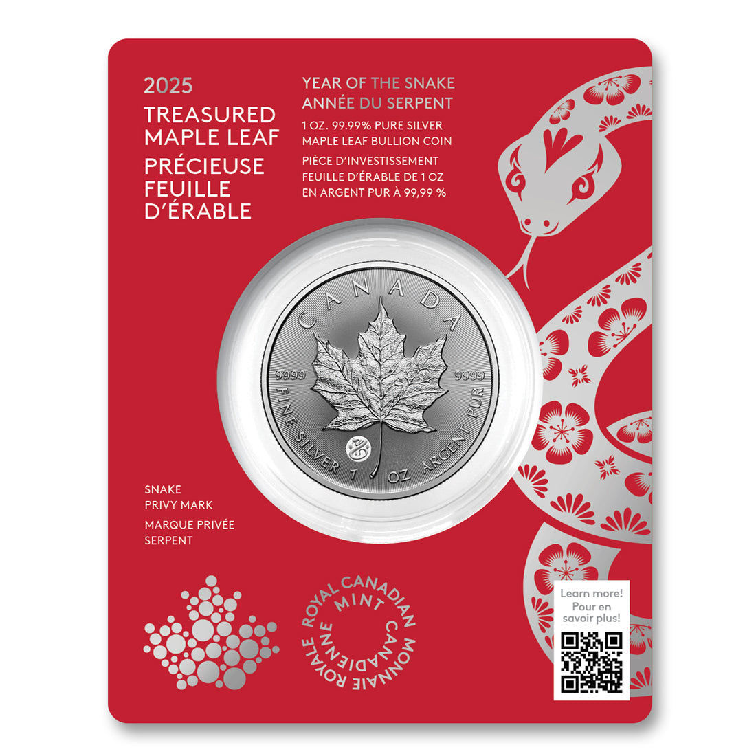 Коллекционная серебряная монета «Кленовый Лист — Год Змеи» 31,1 г 2025 год
