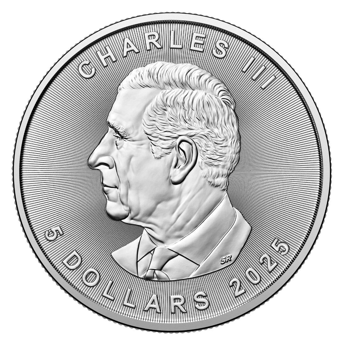Аверс украшает портрет короля Чарльза III в левом профиле. Вокруг размещены надписи «CHARLES III», «5 DOLLARS» и «2025». Фон выполнен в виде тонких лучей, исходящих из центра, что придает изображению глубину и сияние.