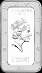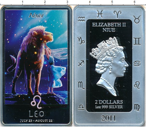 Аверс украшен портретом королевы Елизаветы II, окружённым символами всех зодиакальных знаков. Надписи «ELIZABETH II», «NIUE», «2 DOLLARS» и «1oz 999 SILVER» указывают на страну выпуска, номинал и пробу серебра, подчёркивая официальный статус монеты.