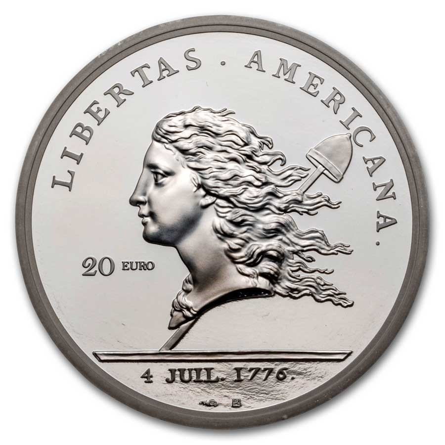 На аверсе изображён аллегорический портрет Свободы — Libertas Americana, символизирующий рождение американской нации. Её распущенные волосы развеваются на ветру, а на голове фригийский колпак, знак освобождения от тирании. Вокруг размещена надпись LIBERTAS AMERICANA, а под изображением дата 4 JUIL. 1776, обозначающая день провозглашения независимости США. Слева указан номинал 20 EURO.