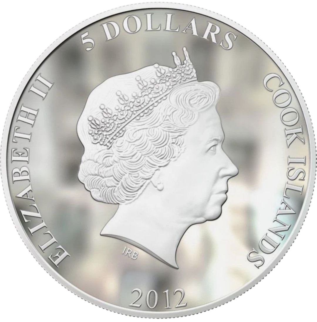 На аверсе монеты изображён портрет Её Величества королевы Елизаветы II в профиль. Вокруг расположены надписи: «ELIZABETH II», «COOK ISLANDS», «5 DOLLARS» и год выпуска «2012». Зеркальный фон гармонично сочетается с рельефным изображением, подчёркивая элегантность и высокое качество исполнения.