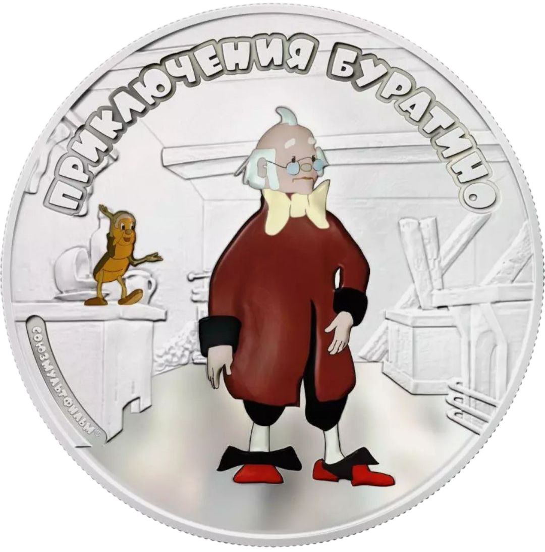 Реверс монеты украшен цветным изображением героя мультфильма — мастера Джузеппе (или папы Карло) вместе с Кузнечиком-Цвыркуном. Они изображены в своей мастерской на фоне деревянных деталей интерьера. Надпись «ПРИКЛЮЧЕНИЯ БУРАТИНО» расположена в верхней части. Художественное сочетание цветов и рельефа создаёт живой и выразительный образ сцены.