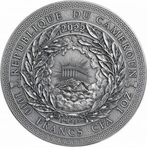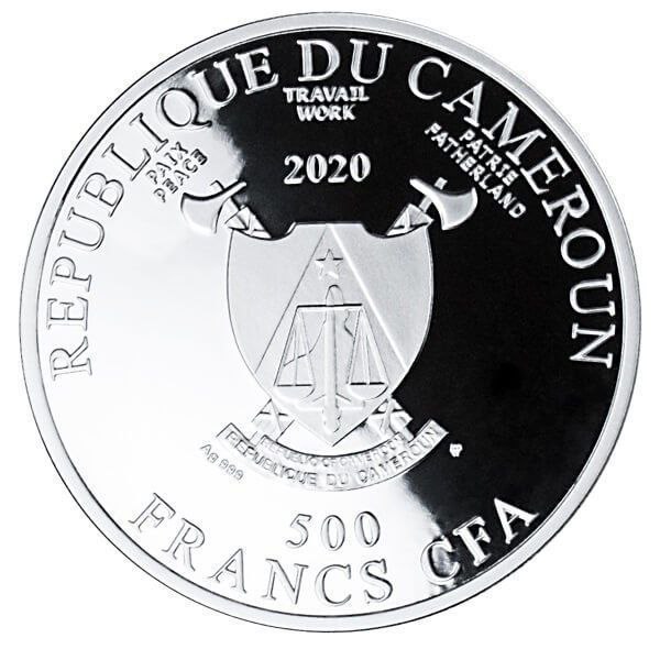 На реверсе монеты показан герб Республики Камерун, который включает щит с изображением весов правосудия, перекрещённые копья и ленту с названием страны. Вокруг расположены надписи «REPUBLIQUE DU CAMEROUN», номинал «500 FRANCS CFA» и девизы «PAIX, TRAVAIL, PATRIE» («Мир, Труд, Отечество»). В верхней части реверса указан год выпуска — 2020. В нижней части также присутствует маркировка пробы серебра — Ag 999.