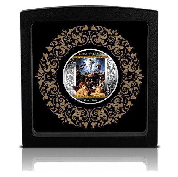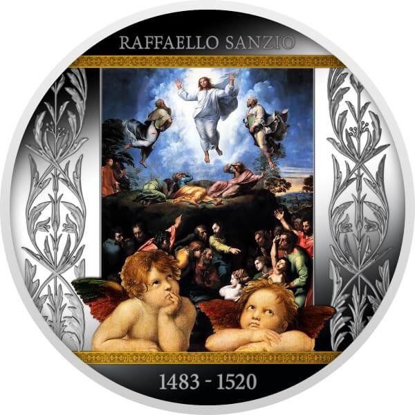 На аверсе монеты изображена подробно выполненная цветная репродукция картины «Преображение» Рафаэля, окружённая декоративными орнаментами, выполненными в виде утончённых растительных мотивов. В верхней части размещена надпись «RAFFAELLO SANZIO», а внизу указаны годы жизни художника — 1483–1520. В нижней части композиции изображены знаменитые ангелы-амуры, являющиеся узнаваемым элементом творчества Рафаэля.