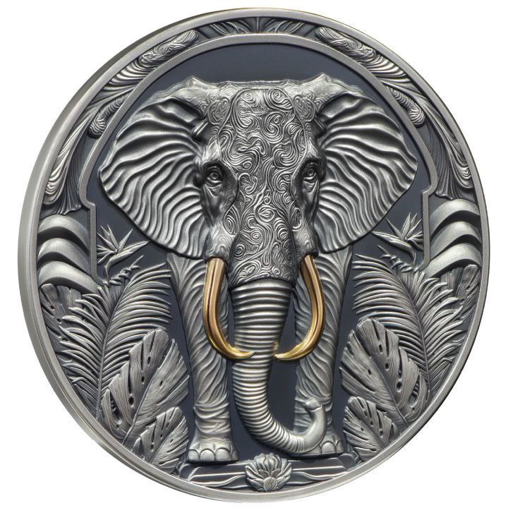 Реверс монеты поражает изображением слона, гордо стоящего среди тропической растительности. Каждая деталь его тела выполнена с невероятной точностью — от складок кожи до сложного узора на голове, придающего образу благородство и духовную глубину. Позолоченные бивни создают контраст и подчеркивают мощь животного. Фон с растительным орнаментом создаёт ощущение джунглей, где царит гармония дикой природы.