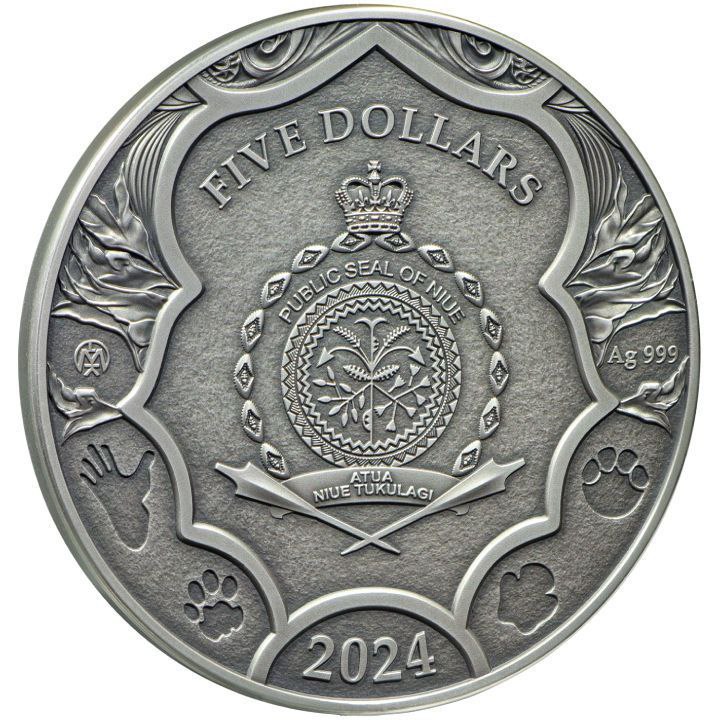 Аверс монеты украшен официальной печатью Ниуэ, окружённой декоративной рамкой с природными мотивами. В верхней части размещена надпись «FIVE DOLLARS», внизу — год выпуска «2024». Слева и справа видны рельефные отпечатки лап животных, символизирующие единство всех живых существ. В центре композиции расположен герб с девизом «ATUA NIUE TUKULAGI» — «Бог, хранитель Ниуэ». Также указана проба серебра «Ag 999».