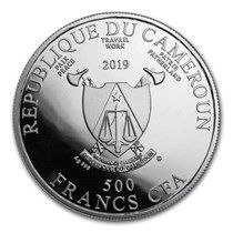 На аверсе изображён герб Республики Камерун, номинал «500 FRANCS CFA» и год выпуска «2019». Вдоль канта размещены слова национального девиза «PAIX – TRAVAIL – PATRIE» («Мир – Труд – Отечество») и обозначение пробы серебра «Ag 999».