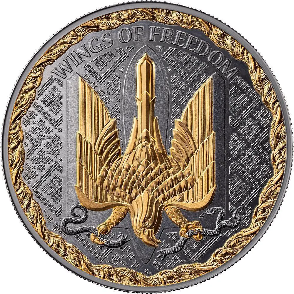 Реверс монеты посвящён теме свободы, которую олицетворяет могучая птица с расправленными крыльями, выполненными в виде позолоченного трезубца — символа национального достоинства. Её когти сжимают змей, символизирующих побеждённое зло, а фон украшен орнаментом в стиле украинской вышивки — оберегом силы и единства. По кругу размещена надпись «WINGS OF FREEDOM», подчёркивающая идею возрождения и полёта к светлому будущему. Край монеты украшен декоративной рамкой в виде венка из колосьев и лавровых ветвей, символизирующих победу, процветание и мир.