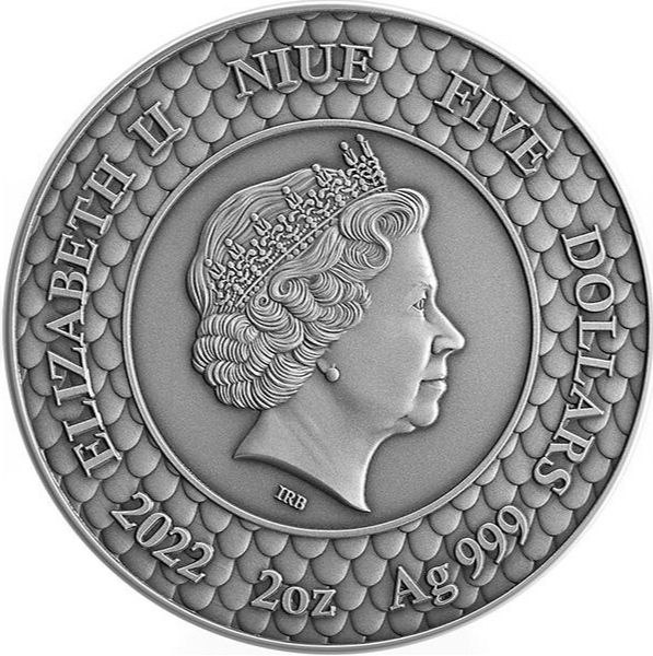 Аверс монеты украшен портретом Её Величества Королевы Елизаветы II. Вокруг портрета размещён рельефный фон в виде чешуи, напоминающей кожу дракона. По окружности выгравированы надписи «ELIZABETH II», «NIUE», «FIVE DOLLARS», «2022», «2 oz», «Ag 999», указывающие на эмитента, номинал, год выпуска, вес и пробу серебра.