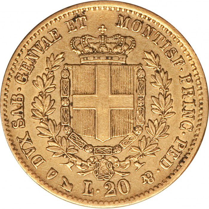 Реверс монеты украшен гербом Сардинского королевства — щитом с крестом под короной, окружённым лавровыми и дубовыми ветвями, символами славы и мощи. Вдоль края размещена латинская надпись «DVX SAB. GENVAE ET MONTISF. PRINC. PED.», указывающая на титулы короля как герцога Савойского, Генуэзского и князя Пьемонта. Внизу обозначен номинал «L. 20» и монетный знак. Композиция реверса создаёт ощущение величия и классической монархической гармонии.