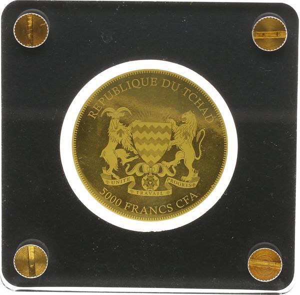 Аверс украшает государственный герб Республики Чад, обрамленный надписью REPUBLIQUE DU TCHAD. Герб поддерживают два животных, держащих щит с волнистыми линиями, под которым расположена лента с девизом «UNITE – TRAVAIL – PROGRES» («Единство – Труд – Прогресс»). В нижней части указан номинал — «5000 FRANCS CFA». Изысканная полировка и четкость рельефа подчеркивают официальный статус выпуска.