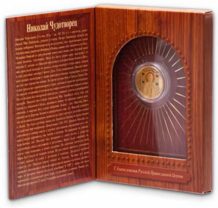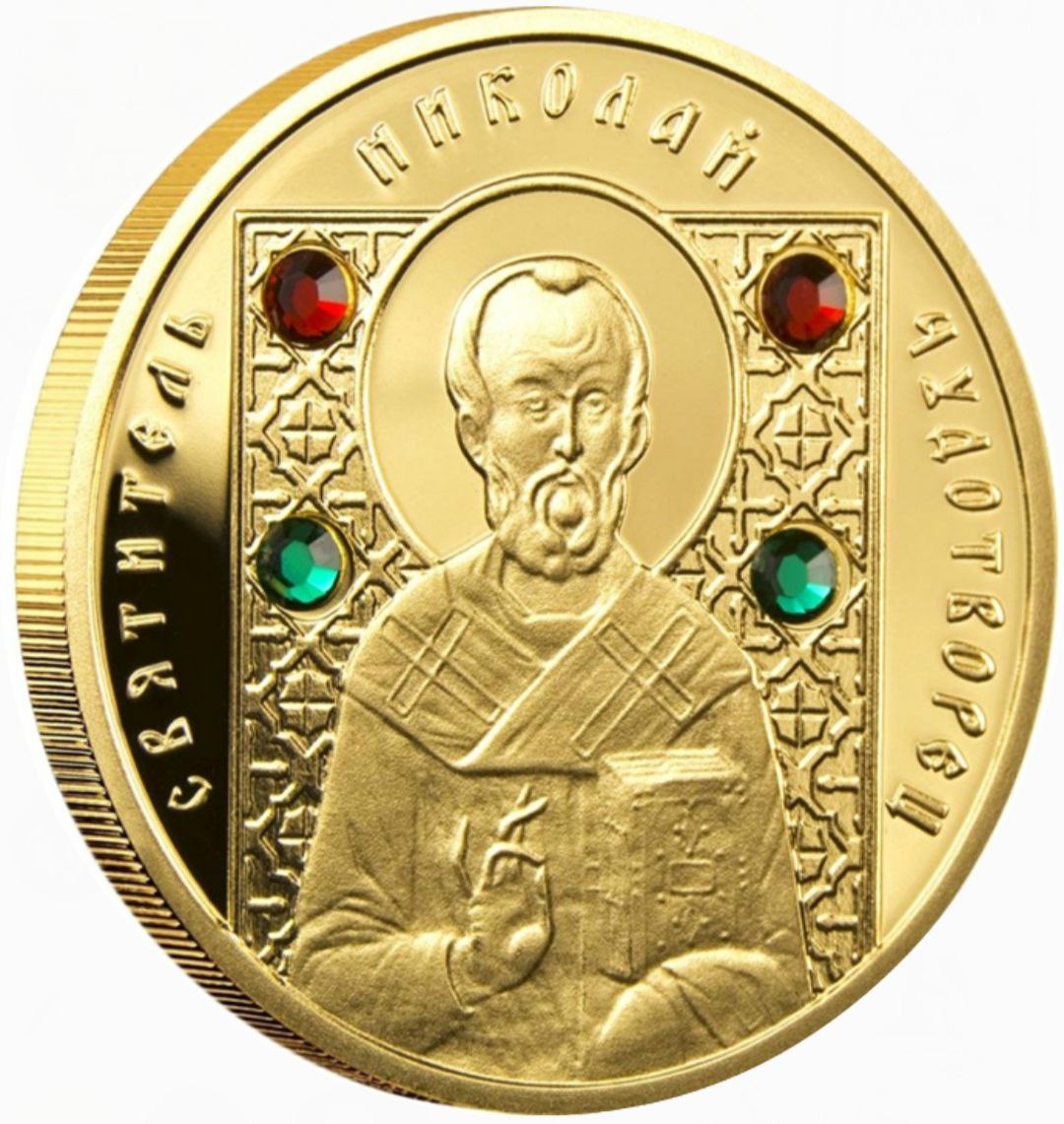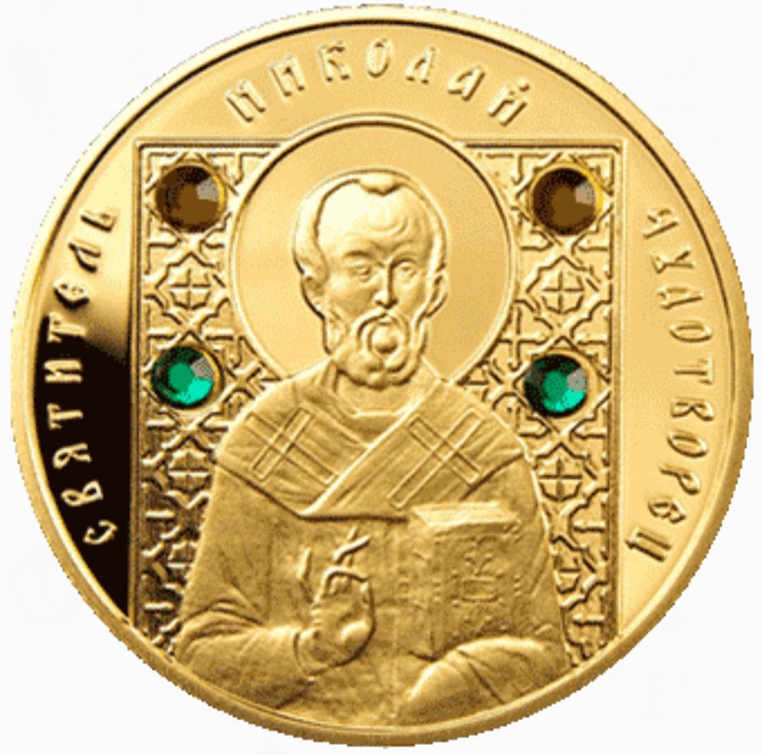 Золотая монета «Николай Чудотворец» 2008 года выпущена Национальным банком Республики Беларусь в серии «Православные святые». Она посвящена одному из самых почитаемых христианских святых — Святителю Николаю Мирликийскому, покровителю путешественников, детей и всех нуждающихся. Эта монета сочетает духовную символику, изящное художественное исполнение и благородный блеск золота, что делает её настоящей реликвией для верующих и коллекционеров.