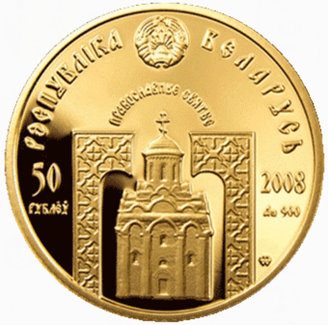 На аверсе монеты изображён герб Республики Беларусь, архитектурный силуэт православного храма и орнаментальные элементы, напоминающие византийские мозаики. По кругу размещены надписи «РЭСПУБЛІКА БЕЛАРУСЬ», «ПРАВАСЛАЎНЫЯ СВЯТЫЯ», номинал «50 РУБЛЁЎ», год выпуска «2008» и обозначение пробы золота «Au 500». Композиция создаёт ощущение величия духовного наследия белорусской земли.