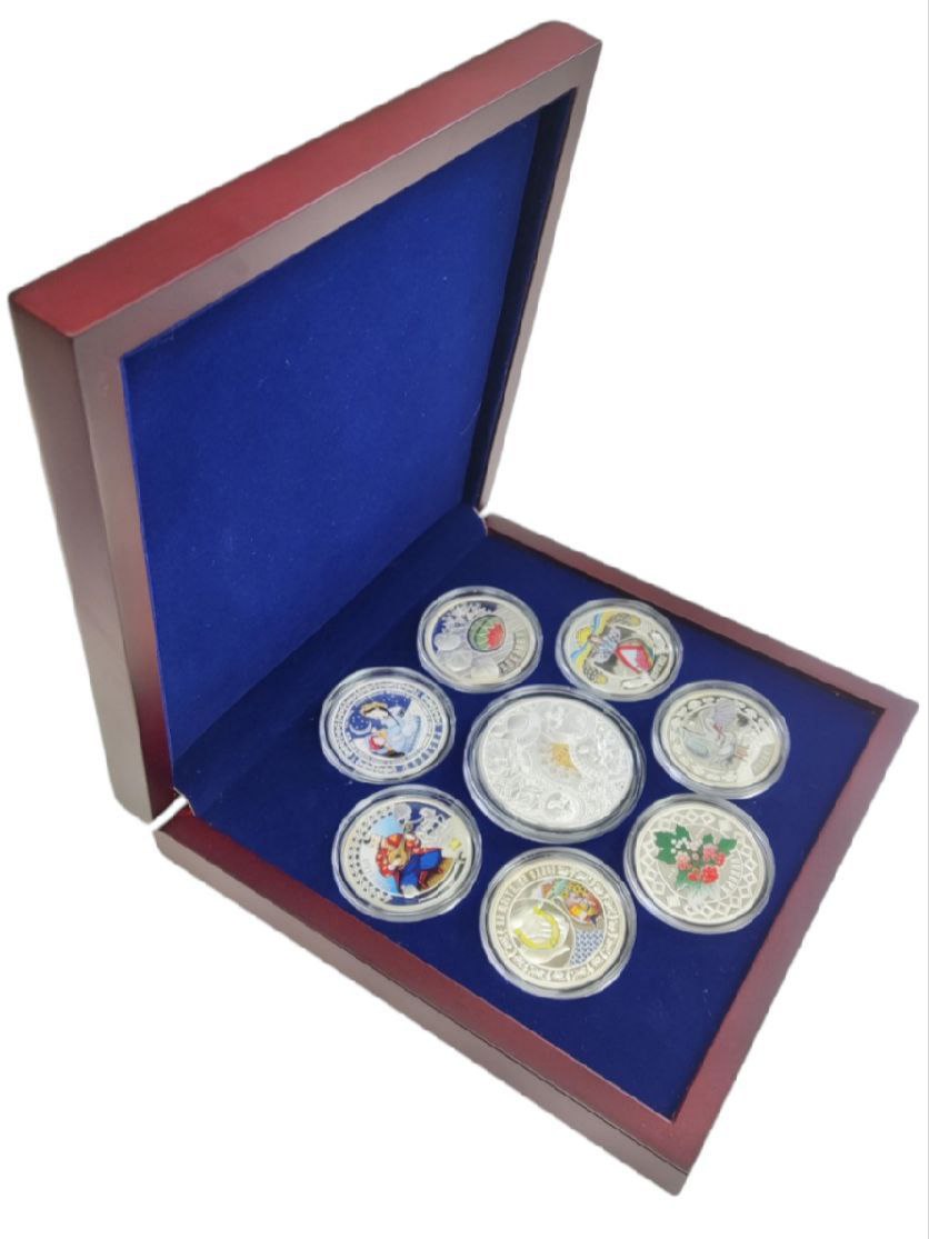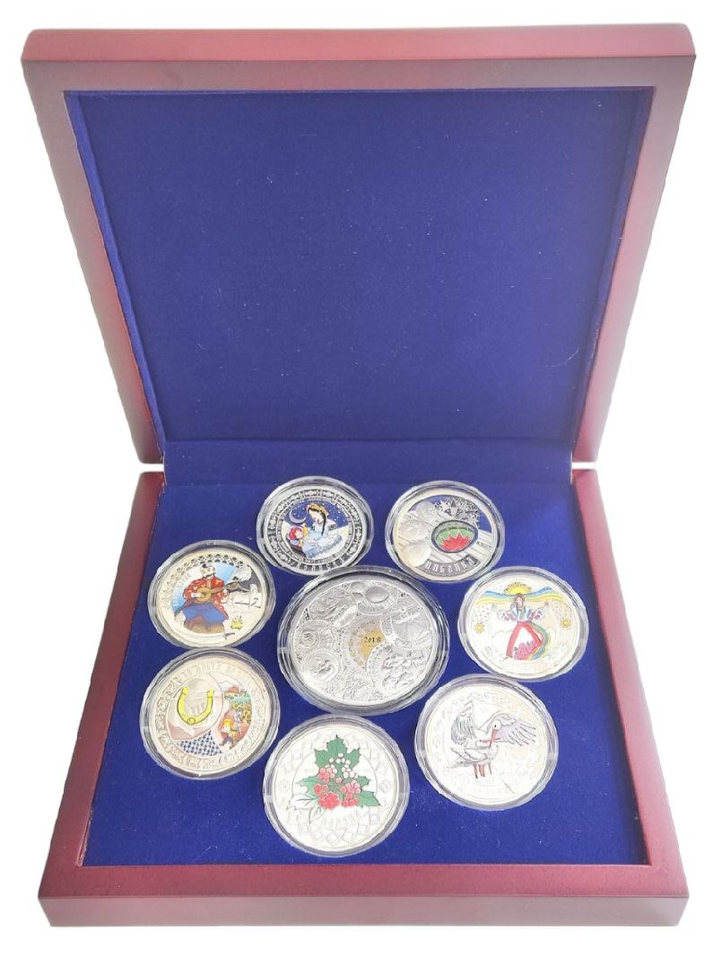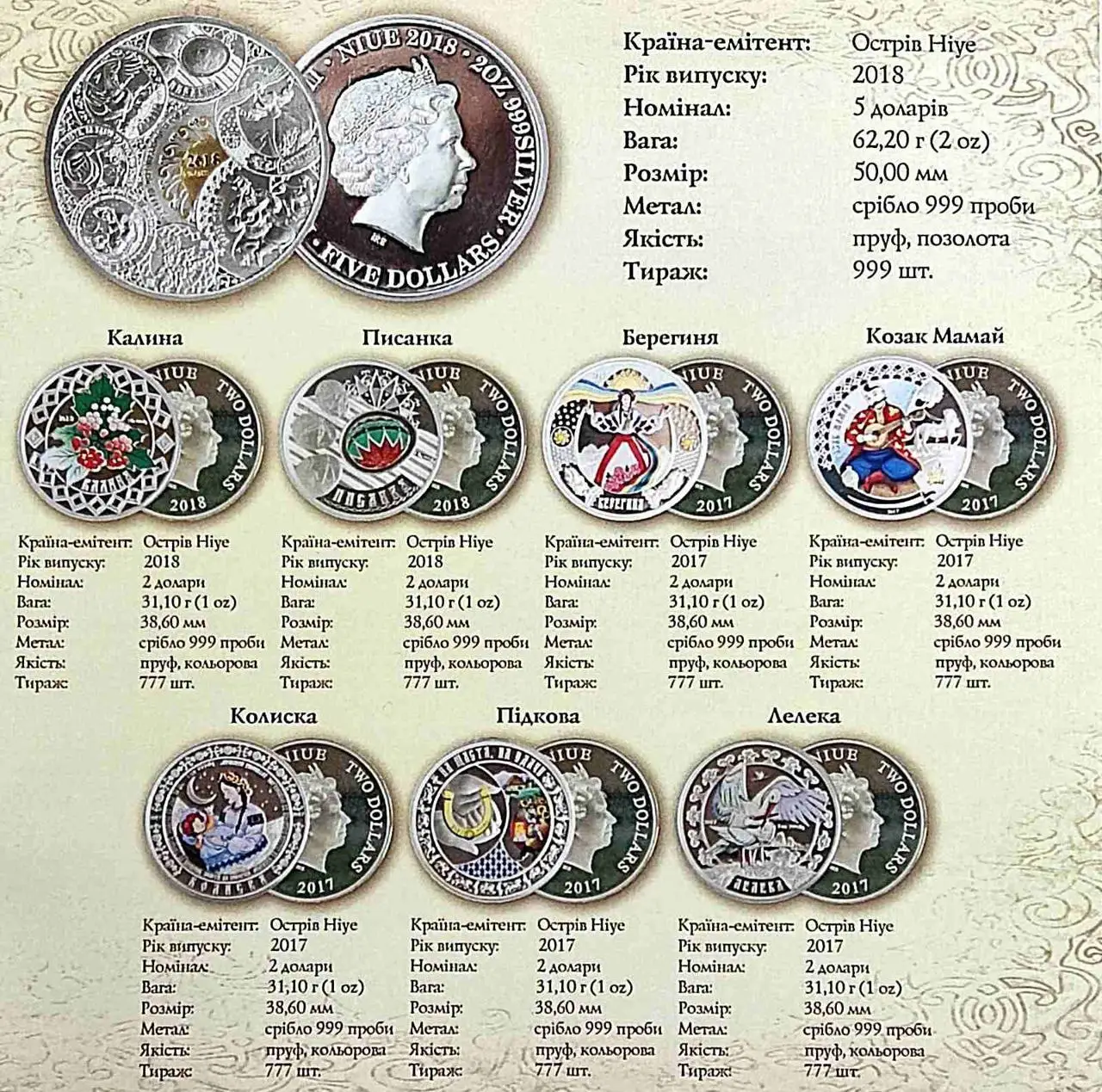 Набор представлен в роскошной деревянной коробке с мягкой синей бархатной отделкой. В центре расположена монета номиналом 5 долларов «Украинские традиции» 2018 года, окружённая семью монетами номиналом 2 доллара: «Калина», «Писанка», «Берегиня», «Козак Мамай», «Колыбель», «Подкова» и «Аист». Каждая монета изготовлена из серебра 999 пробы, имеет цветное оформление и ограниченный тираж — всего 777 или 999 экземпляров, что придаёт коллекции особую ценность.